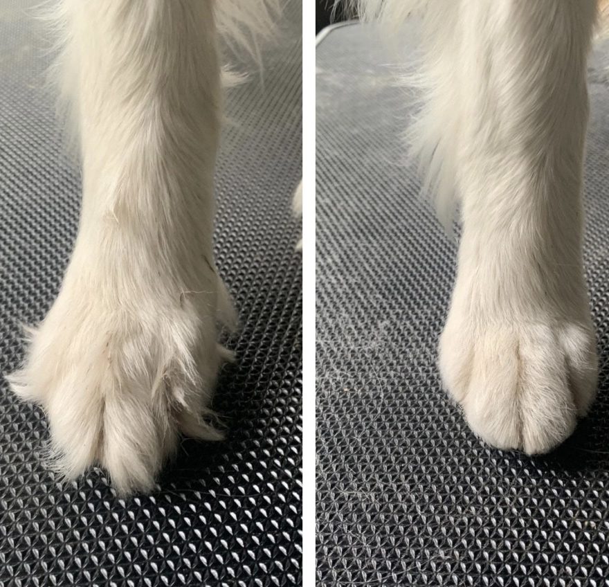 Trim and/or Dremel nails and shave paw pads and scissor tidy into neat paws.